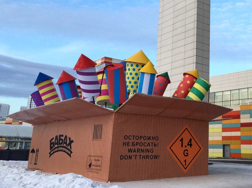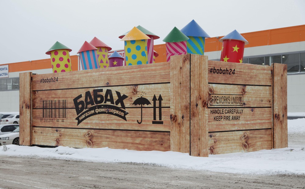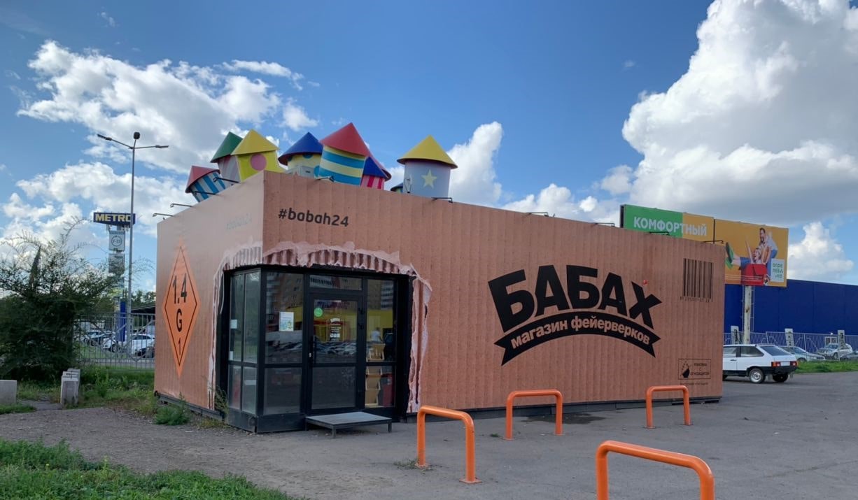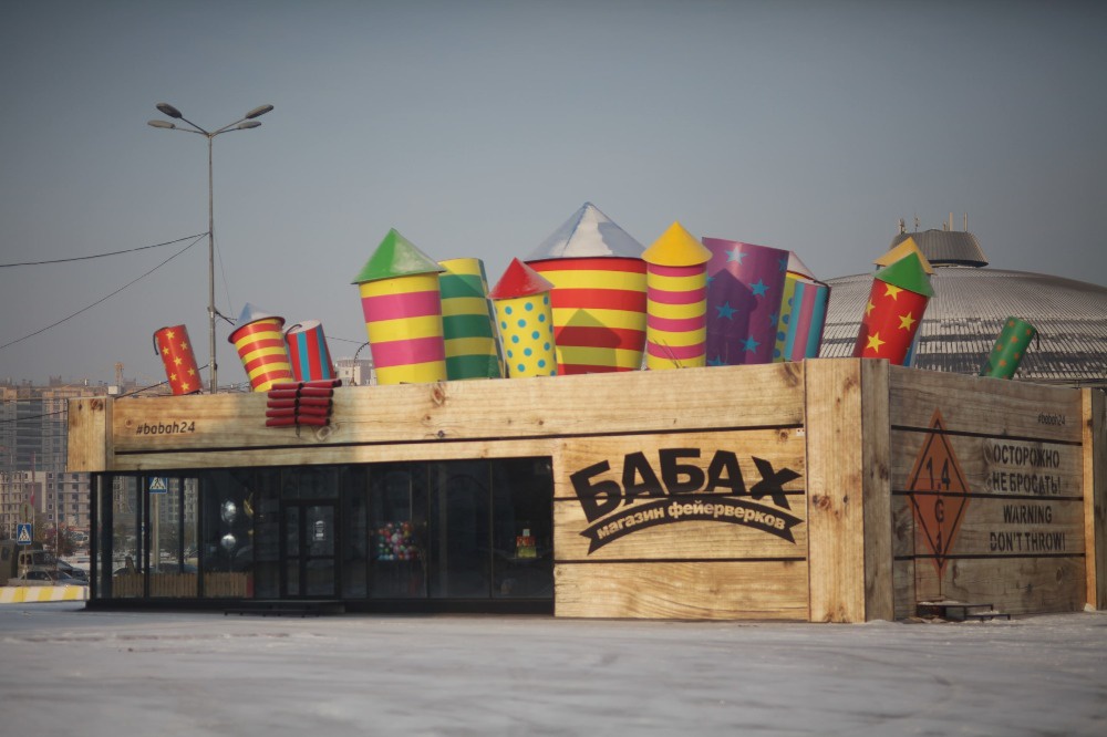 Первый магазин «Бабах» в виде коробки с ракетами на крыше, был изготовлен нашей компанией в 2016г.
