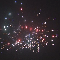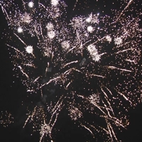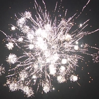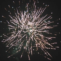 Разноцветные мерцающие пионы; золотая парча с треском; зеленые мерцающие облака; золотой мерцающий дождь. Финал - ива с треском.