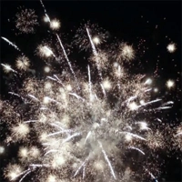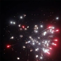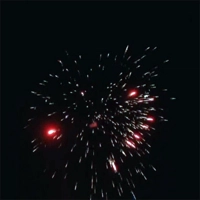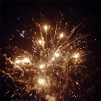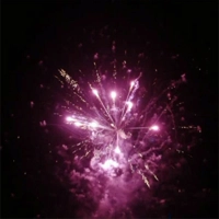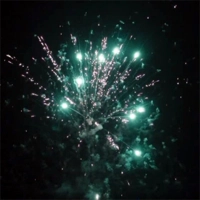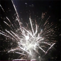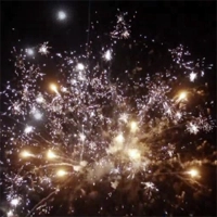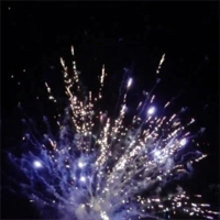 Серебряный мерцающий букет переходит поочередно в облака из мелкого и крупного треска с вкраплениями желтых, красных, зеленых, голубых и фиолетовых жемчужин. Финал — королевская парча в облаке золотого треска