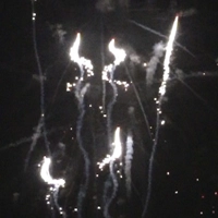 Разноцветные пионы с мерцанием- красные и зеленые хризантемы с треском. Финал - серебряные змейки.