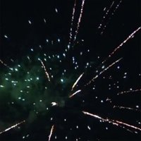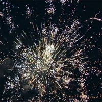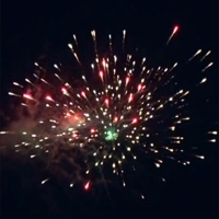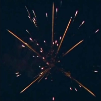 4 эффекта: серебряные вертушки переходят в золотую парчу с красными кончиками, облака из растрескивающихся цветочков, золотую парчу с зелеными кончиками. Финал: синие хризантемы в окружении тысячи серебряных жемчужин.