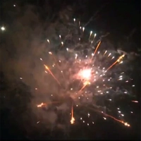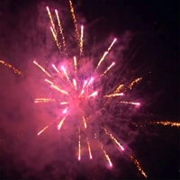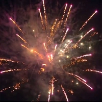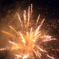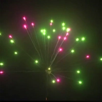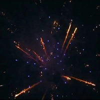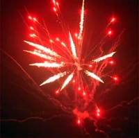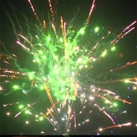 Пурпурно-зеленый пион, парчовая корона с красными звездами, пурпурная пальма с треском, золотая ива с синими звездами, зеленые звезды и белые стробы, трещащая ива с голубыми звездами, парчовая корона с треском.