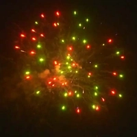 Первые несколько залпов - это пышные россыпи из ярких красных и зеленых звезд, которые летят вверх, раскрываясь в огромные цветочные облака с различными жемчужинами. Они создают невероятный эффект ярких переливов и переливающихся цветов, наполняя небо своей блестящей красотой.