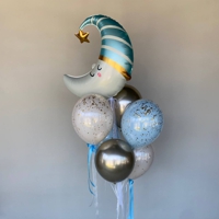 Фонтан из шаров к рождению мальчика. В составе: фольгированный шар-луна, хром-шары небесно-голубого цвета, прозрачные шары с конфетти. Соединено атласными лентами. Подходит для фотозоны, выписки из роддома и домашнего торжества.